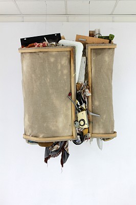 Bartosz Kokosiński follows his artistic agenda in a multi-threaded, but not necessarily polyphonic way. It rather resembles a gradual metamorphosis, with reducing and rebuilding, yet not so much the narrative threads as the graphic forms. In the attached photographic documentation, the author presents several recent works. His first attempts to use the unconventional (i.e. bent) surfaces date back to his student years, when they had a slightly decorative, design character. In an exceptional, manually dexterous way, Kokosiński tried to reconcile the attractiveness of the object itself with the embedded “attractiveness” of the painting aspect based on figurative elements. The latest works show the young artist’s maturity and courage. He has given up mimetic presentations in favour of more metaphorical corporeality, which gives his objects-pictures an entirely new dimension. Kokosiński reflects on the phenomenon of visual imagery, more physically than speculatively, meditating at a certain distance from the material itself. He devastates canvas painting, deconstructs, overthrows and pushes it out, but all these gestures still entangle him in an unequivocal context. It must also be noted that his artistic imagination, concentrating mainly on objects (and to some extent video), is almost unlimited. Every single intuition, including those seemingly unfeasible, is thoroughly processed and results in a complete artifact shaped precisely the way the artist described earlier in an informal conversation. Kokosiński is extremely concentrated while working. It allows him to find difficult but fully convincing graphic solutions which, despite their roughness, remain visually alluring without falling into the “optical charade” trap. He is an artist whose skills, energy and imagination are seldom seen in one person. He could easily paint conventionally with equal success, or juggle various styles. However, he has chosen his own way without calculating whether it would pay off in terms of limelight publicity or not. I wholeheartedly recommend both the artist and his attitude.